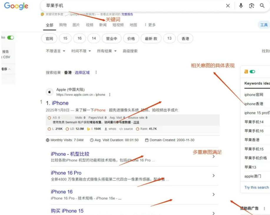 比如我跟某个知识星球的伙伴说过,用户搜索“苹果”大概率是想购买,搜索“苹果树”,大概率是想了解历史或者起源,或者怎么去种植,搜索“苹果手机”,是想购买,对比,评测,了解最新款等等,从这些词你就可以看到可能一个搜索词就有很多种需求,多种搜索意图,了解了才能做出相应的内容或者产品等,你肯定不能用户搜的是苹果手机,你出来的是购买水果苹果的页面吧,那用户就会马上跳出,你的跳出率(bounce rate)就会非常高,SEO信号就很差。