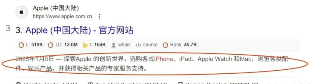 既然这个搜索词已经提现了购买意图,那元描述就应该更详细的描述你这个购买页面主要的是什么内容,比如apple的元描述是:探索apple的创新世界,选购各式的产品,获得相关产品的专家服务支持。这里你猜满足了几个搜索意图?当然用品牌来举例是不太恰当的,但是学习是没问题,比如创新,为什么很多人喜欢苹果,这个是一点。第二个选购格式的产品包括苹果手机,完全满足意图,第三,专家服务支持,买了苹果出售后了怎么办,我有些售前问题怎么办,完美解决。